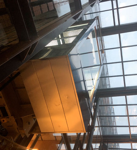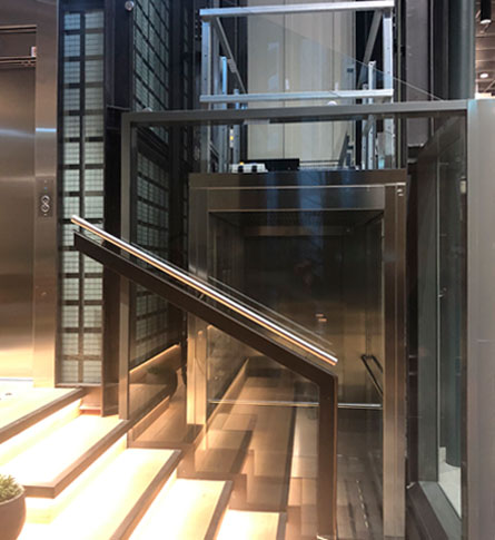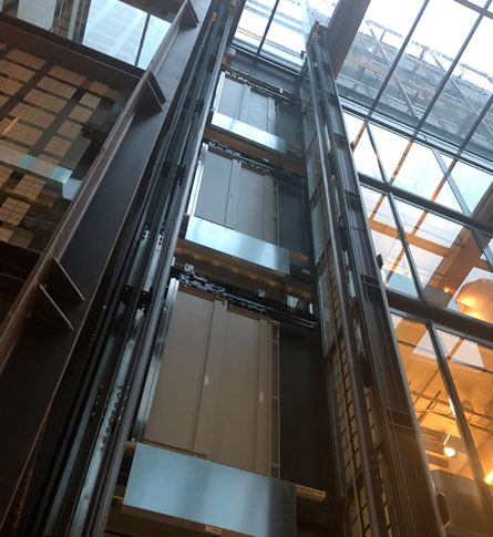 Este proyecto, que involucra un edificio de oficinas moderno y vanguardista, implicó la reforma de un ascensor existente y su adaptación a maniobra dúplex con un segundo equipo suministrado por nosotros, concretamente un ascensor sin cuarto de máquinas modelo Silens Pro Vanguard II de 8 paradas, con cabina panorámica y un hueco abierto que deja al descubierto ambas instalaciones. El ascensor modernizado, una unidad para 1000kg/13 personas, daba servicio a 13 paradas con doble embarque a 180º y una velocidad de 1,6 m/s.