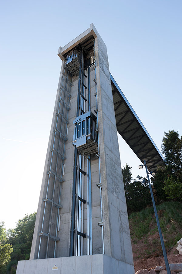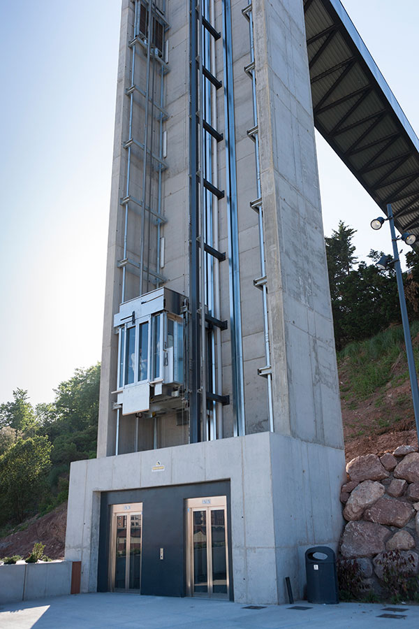 - Una característica singular de los dos elevadores panorámicos es su especial sistema de rescate de cabina a cabina diseñado por IMEM. Al no existir escalera de emergencia a la lo largo del recorrido de 30 m con solo dos paradas, IMEM propuso la implementación de un rescate que pudiera practicarse de cabina a cabina, de modo que en caso de inmovilización de un ascensor con personas atrapadas en su interior por cualquier circunstancia, pueda practicarse su evacuación a través de unas puertas de socorro habilitadas en ambas cabinas que conectarían con la cabina adyacente.