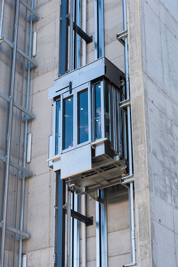 - Los dos ascensores panorámicos intemperie instalados en la torre posibilitan una espectacular vista de la ciudad y la bahía de Santander mientras viajan por los más de 30 metros de recorrido que separan las dos únicas paradas. Las espaciosas cabinas, capaces de transportar hasta un total de 21 personas cada una de ellas, están equipadas con aire acondicionado y acabadas en acero inoxidable especial. Las inclemencias meteorológicas a las que están acostumbrados los santanderinos también han sido tenidas en cuenta en el diseño de estos dos ascensores panorámicos, dado que al encontrarse instalados en intemperie han sido provistos de toda su parte mecánica en acabado galvanizado incluyendo guías y cables. Además, se ha diseñado para el proyecto un guiado para el cable múltiple de los equipos, de modo que éste queda oculto y protegido, con lo que se logra una instalación muy limpia y elegante.